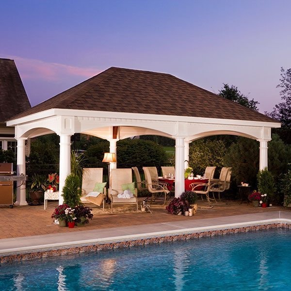 , the Hampton Pavilion is lined with impressive columns. This Amish pavilion kit is made with solid pine wood encased in vinyl. This unique vinyl pavilion comes with powder coated anchor brackets at the base of each column to attach to a concrete pad or wood deck.