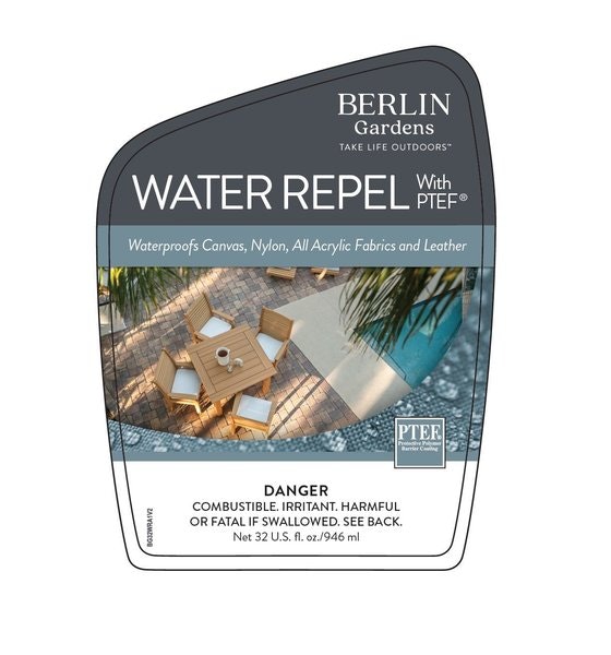 Extend the life of your outdoor furniture cushions with Berlin Gardens Fabric Water Repel, a high-performance fabric protector specially designed for outdoor use. Whether you’re preparing for summer gatherings or protecting your patio cushions from surprise rain showers, this spray-on solution creates a powerful barrier against the elements. Formulated with PTFE and UV protection, it helps water bead up and roll off instead of soaking in — keeping cushions dry and comfortable. The UV shield also protects fabric colors from fading due to sun exposure, so your cushions stay vibrant longer, even in harsh sunlight. This water repellent is easy to apply. Just a few sprays from the convenient bottle and your cushions are ready for outdoor living — rain or shine.Product Benefits: