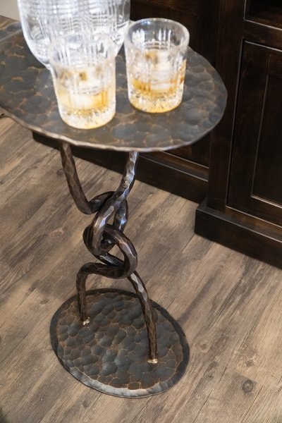 Sculpted from wrought iron metal, the Hand Forged Small Drink Table will seamlessly complement your favorite spot on the couch, recliner, or accent chair.