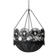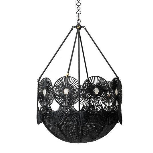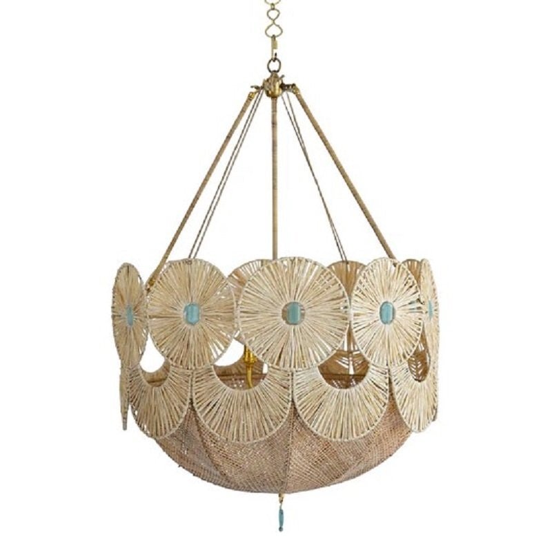 The Robbie Beaded Chandelier transforms any room into a space of warmth and artisanal charm, serving as both a functional light source and a striking focal point. Its design captivates with a series of sunburst-shaped woven motifs, each radiating outward from a delicate blue bead that adds a subtle, refreshing accent. These circular elements are arranged in a rounded frame, creating a balanced, organic silhouette that feels both handcrafted and thoughtfully composed. Below, a scalloped edge softens the structure, while the woven texture gently filters light, casting warm, dappled patterns that turn everyday moments into something special.