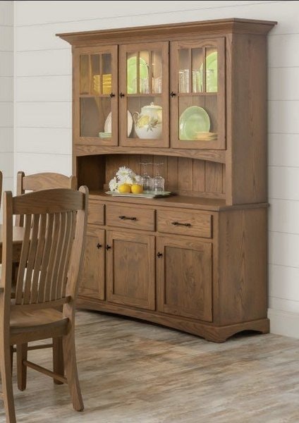 Perhaps you have a large collection of dishes and keepsakes. The Amish Grand Arts & Crafts 63" Open Deck Dining Hutch has room to store and display them beautifully! A wood hutch becomes so much more than just a cabinet. Part of your dining room or kitchen, this peek at finery makes for a special addition to your home furniture collection and is furniture that becomes part of your story. The Amish Grand Arts & Crafts 63" Open Deck Dining Hutch has a lovely top display area, a counter space and a lower case with 3 drawers and 3 cabinets for storage.