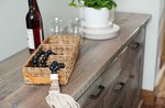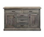 The design balances functionality with rustic appeal. Up top, two spacious drawers offer easy access to smaller dining essentials like napkins or utensils, while three deep lower drawers provide room for linens or serving pieces. Flanking the drawers, two cabinet doors open to reveal additional storage, perfect for hiding bulkier items or keeping essentials within reach but out of sight. The clean, straightforward layout ensures it’s as useful for everyday meals as it is for hosting gatherings, where it can double as a buffet to display dishes or hold drinks.