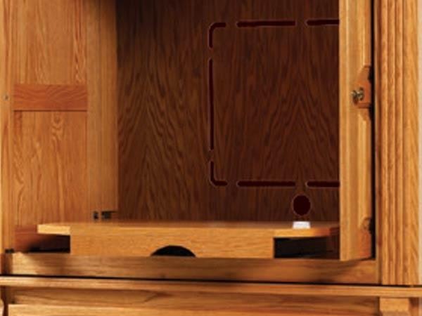 With such a versatile piece, you have the option to store your clothes and delicate items on the adjustable shelves or add the optional clothes rod and hang your shirts and pants in a convenient location. The Jacque Armoire can also be customized with pocket doors, a shelf with TV Swivel and a knockout back to accommodate your TV and keep a clean and tidy appearance without missing your modern luxuries.