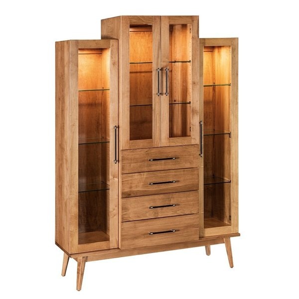 Inside, adjustable shelves provide the flexibility to arrange items of varying heights, from tall vases to compact trinkets. LED lights come standard, casting a warm glow that highlights the natural beauty of your displays, making even everyday objects feel special. Crafted from solid hardwood by Amish artisans in Indiana, the cabinet boasts durability you can trust, with details like full extension drawer slides for easy access and soft closing hinges that ensure quiet, gentle use.