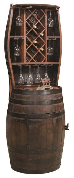 A barrel is crafted into storage, display and serving space in one. Imagine this fine wine storage as part of your rustic furniture collection.
