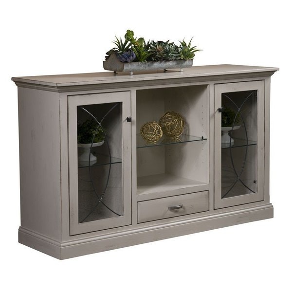 The design shines with its attention to detail, particularly the cabinet doors featuring elegant leaded glass panels. These panels are framed by a gentle, curved pattern that adds a subtle artistic touch without overcomplicating the look—perfect for those who appreciate understated sophistication. The doors sit flush with the sideboard’s frame, creating clean, seamless lines that enhance its transitional aesthetic, easily complementing both traditional and modern decor. Between the glass-fronted cabinets, an open center compartment with an adjustable glass shelf offers convenient access to frequently used items, while a smooth, functional drawer below provides tucked-away storage for linens, flatware, or other dining necessities.