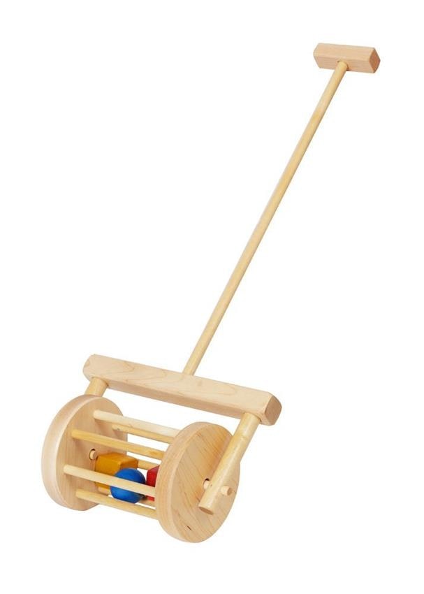 Meant to be pushed around, this wooden nursery push toy roller is reminiscent of the old push mowers! Inside the roller housing are several wooden blocks for click sound effects and eye-catching color. This item can also be ordered unfinished.