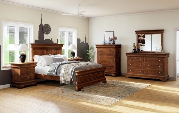 This luxurious 4-piece bedroom set is majestic and bold. This set includes a 6-drawer dresser, 6-drawer tall chest, one 2-drawer nightstand, and your choice of bed frame size.