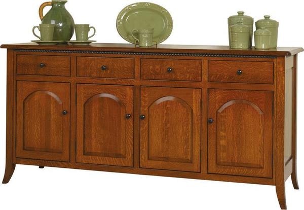 DutchCrafters customers love the options to customize their furniture and they often describe how happy they are with the quality construction. The Amish Bunker Hill 4-Door Buffet with 4 Drawers lines the dining room with an exceptional solid wood storage cabinet. Bunker Hill has raised panel doors, each with a perfect arch in the panel. It has short legs that are gracefully curved. There's adjustable shelving and lots of wood and finish options.