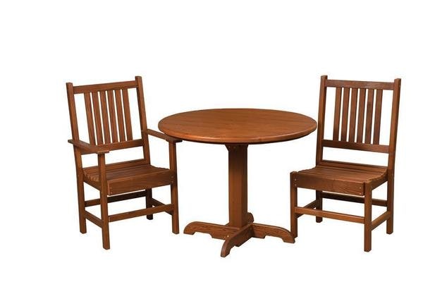 A single pedestal wooden outdoor table is sure to bring the conversations round! The two cedar wood chairs offer a rich and contoured seat, with attractive mission style slat work gracing the chair back. Select side or arm chair styles to go with this outdoor round table.