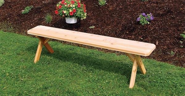 This traditional style outdoor bench has charming crossed bench legs and zinc plated hardware that resists rust. For party seating, outdoor dining or relaxing under the stars, this cedar outdoor furniture is Amish made and built to last.