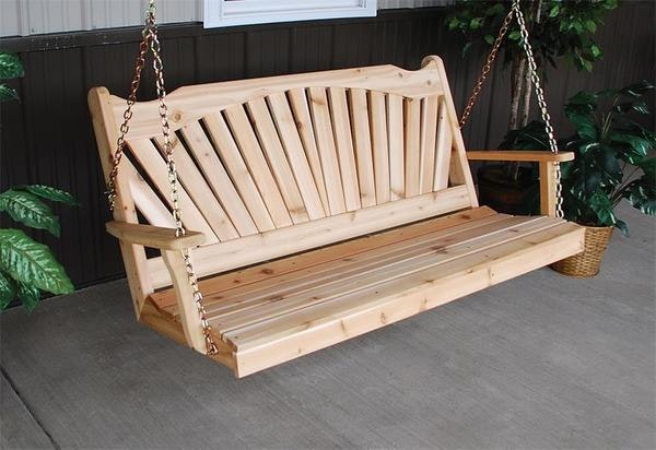 Beautiful cedar wood is fashioned into a lovely fan back design featured in the Amish Western Red Cedar Fan Back Swing. Custom made for your porch or patio, this cedar outdoor furniture will quickly become your favorite spot to read, rock and relax. Cedar wood makes a great porch swing that you can enjoy for years. Amish made in Pennsylvania, this porch swing is custom made to your specifications.