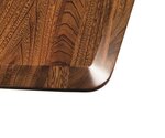 This contemporary Amish Emily Extension Table extends to fit more serving ware, food, and guests! The dining table comes one 18" extension and an additional can be added for even more surface space. The bow-shaped top is shown with a unique elm wood top with Michael's Cherry stain. The sabre style legs and skirts are shown in affordable brown maple wood with handsome Onyx stain.