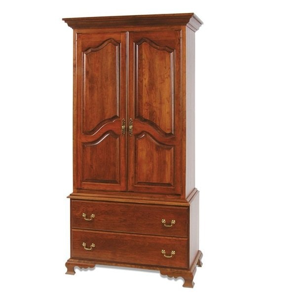 The upper cabinet features two doors with elegantly curved panels, their soft, arched lines adding a gentle warmth to the armoire’s structured form. This subtle shaping elevates the piece beyond basic storage, creating a focal point that feels both refined and approachable. Below, two spacious drawers sit flush with the base, their clean fronts complementing the cabinet above for a cohesive look. The armoire rests on gently curved bracket feet, a classic colonial touch that adds stability and a hint of old-world character to the overall design.