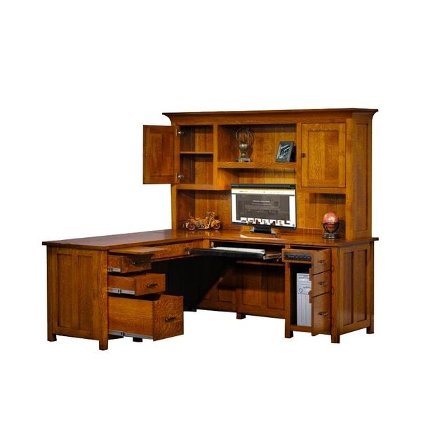 With a versatile style and solid wood strength, the Amish Coventry Mission Corner Desk with Optional Hutch Top offers all the work space, storage and style you need for your busy office. This mission style desk blends right in with many home or office decors. The simple nature of mission style allows the beauty of the solid wood to shine. Top off this wood desk with the beautiful hutch and add a complete set of shelving and display space to keep your office essentials organized while adding some decorative flair.