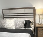 At the heart of its appeal is the upholstered headboard, a perfect balance of softness and structure. Padded panels create a cozy backdrop for morning coffee or evening reading, while horizontal metal accents traverse the upholstery, adding a sleek, contemporary touch that contrasts beautifully with the warmth of the wood. This combination of textures—soft fabric and polished metal—gives the headboard visual depth without feeling busy, making it versatile enough to complement both minimalist and layered decor styles.