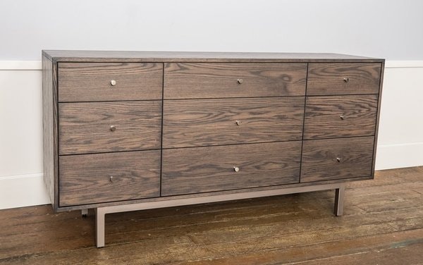 One of the most striking design elements is its low-profile stance, anchored by slender metal legs that add a subtle industrial touch while keeping the overall look light and airy—avoiding the bulk often found in traditional dressers. The nine drawers, arranged in three neat columns and rows, feature flush fronts that enhance the dresser’s smooth, uncluttered aesthetic, allowing the natural grain of the solid wood to take center stage. Each drawer is crafted with dovetail joints, a hallmark of quality craftsmanship that ensures strength and longevity, while full extension slides make accessing even the deepest items effortless, adding practicality to its beauty.