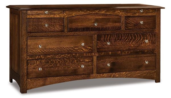 Match our Amish Custom Fern Dresser with Arch Drawer and Jewelry Drawers with your existing bedroom furniture by selecting the right domestic hardwood and finish. Two jewelry drawers at the top of this heirloom dresser will come in handy for nice jewelry storage. Below those, you will have ample storage space with the dovetailed drawers. An arched drawer in the middle and arched base will add a touch of elegance to your suite. You also have the option of adding a beautiful beveled mirror to the top and choosing from a seven drawer or nine drawer dresser.