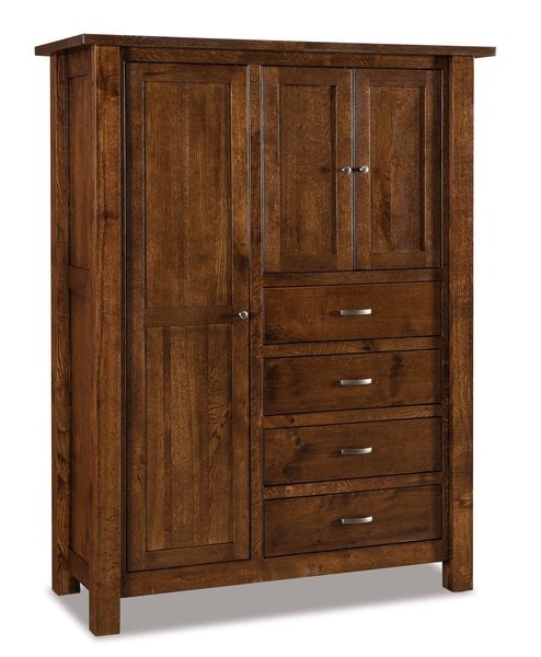 Beyond its craftsmanship, this piece is designed to work for you. The left cabinet houses an adjustable rod, perfect for hanging dresses or suits, while the upper right doors open to reveal shelves—ideal for folded sweaters, hats, or linens. Below, four drawers offer organized space for socks, undergarments, or accessories. Whether you choose rich oak, warm cherry, or another hardwood, the 1" solid wood top crowns the piece with a sturdy, substantial feel that ties the whole look together.