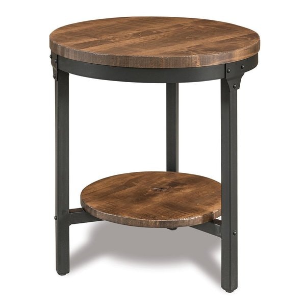 Meet our Amish Dutton 22" Round End Table with Shelf. Made from rough sawn lumber to give the look of barn wood, a round 1 1/8 inch thick top sits upon a steel, power-coated base.