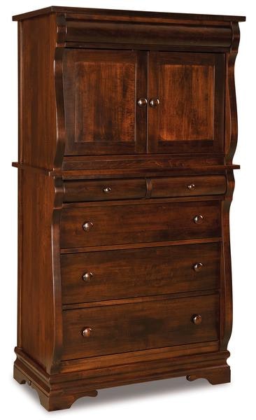 The elaborate details of the Amish Edna Sleigh Chest Armoire adds an air of sophistication to your bedroom suite. The delicate curvature that frames the cabinet and doors along with the one inch overhang are both nice features of this french country style armoire.