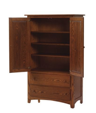 - The Farmhouse Armoire is shown in oak wood with Michael's Cherry Finish