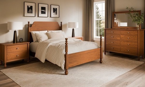 At its center, the bed makes a subtle yet striking statement with its traditional turned bedposts, adding a touch of refinement to the room. The sturdy panel headboard, flanked by these posts, offers a sense of stability and warmth, while the low-profile footboard keeps the space feeling open and airy. It’s the kind of bed that anchors the room, turning bedtime into a quiet ritual rather than just a place to rest.