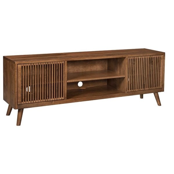 Design details set this media unit apart: Slatted doors on either side add gentle texture, their vertical lines softening the cabinet fronts while maintaining an airy quality. A simple push opens these doors smoothly, revealing storage space without the need for handles that would disrupt the clean, streamlined look. Between them, an open center section with a fixed shelf keeps essentials like a soundbar or decorative items within reach, preventing the unit from feeling heavy or closed off. Tapered legs elevate the base, adding a subtle lift that enhances the piece’s modern, light-footed stance.