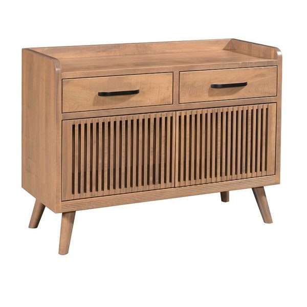 Its contemporary silhouette is defined by distinct, intentional details. The front features sleek, vertical slatted doors that glide open with a gentle push, offering easy access to stored items while maintaining a clean, uncluttered look. Above, two generous drawers provide additional organization; their dovetailed construction reflects meticulous craftsmanship, and full extension ball bearing slides ensure smooth, quiet operation every time you reach for a record or accessory. Tapered legs add a subtle, modern lift, creating an airy feel that complements both minimalist and transitional decor styles.