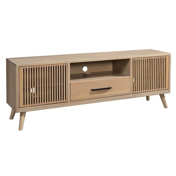 A standout feature is its slatted, push-to-open doors—vertical wooden slats that add texture and a contemporary flair while concealing storage. No handles mean a smooth, uncluttered look, and opening them is effortless, revealing adjustable wood shelves behind each door to accommodate media devices, books, or odds and ends. The central open compartment keeps your streaming devices or soundbar within easy reach, with a discreet cord access hole to tuck away unsightly wires, keeping surfaces neat.