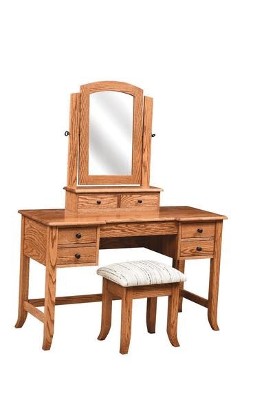 The Amish 50" Fair Haven Dressing Table has many uses. More than just a spot to fix hair and make-up this multi-purpose dressing table can be used as a desk as well as a storage and surface area to display family photos. The Fair Haven features two drawers stacked on either side, a center drawer and two drawers side by side tucked neatly under a matching mirror. A gorgeous addition to master bedroom, closet or guest bedroom, this dressing table is one that can be passed on for generations.