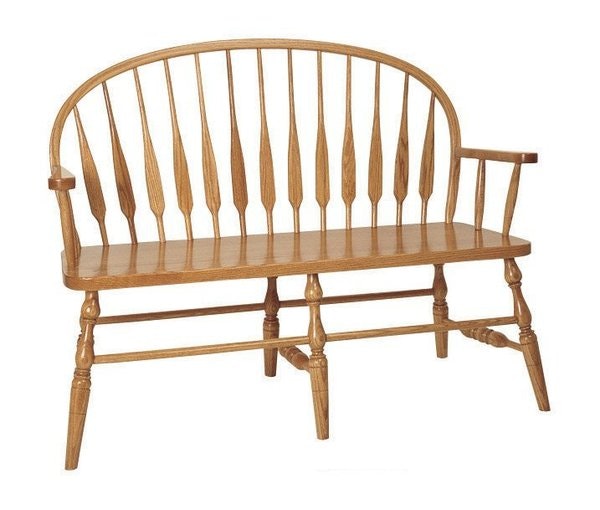 A Windsor style bench has a delightful effect. Full of quality craftsmanship, the Amish Feather Back Windsor Bench offers a warm welcome in the foyer or entryway. This solid wood bench features feather shaped spindles and a steam bent bow top. It can be built with or without arms. The bench legs are turned for added elegance.