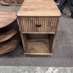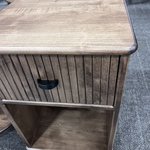 What sets this table apart is its attention to detail, starting with the drawer’s distinctive fluted front. Vertical grooves run the length of the drawer, adding subtle texture that catches the light and gives the piece a refined, artisanal touch—enough to draw the eye without overwhelming the room. Below, an open shelf provides easy access to everyday essentials, from a stack of magazines to a favorite mug or decorative basket, keeping your space tidy yet lived-in.