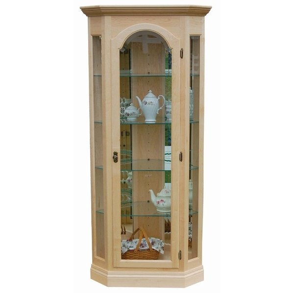 Illuminate a quiet corner with a curio display. This corner curio is shown in hard maple wood which tends to have creamy white sapwood mixed with a reddish brown tinge. This wood grain may be straight or sometimes it can be curly or wavy.