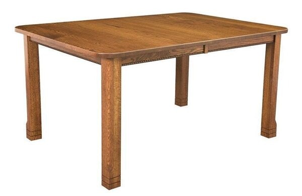 This beautiful Amish table is shown in a 42" x 66" size with a Michael's Cherry stain on solid oak wood. The top is a 4" radius with a Mission edge and our standard 3" square legs with roundover corner. The tabletop skirt and leaves will have the beautiful rope twist detail.