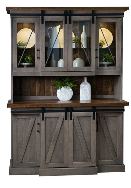 This Four-Door Hutch features sliding doors and a barn-style farmhouse look. 100% authentic Amish craftsmanship ensures that this piece is made with the highest of quality and built to last for generations. Choose between two sizes: 60" and 72" hutches. No matter the width you choose, this hutch will stand 83 1/2" high. Behind the doors in the base you will find adjustable shelves. In hutch top you get adjustable glass shelves. LED lights help highlight your favorite items to display.