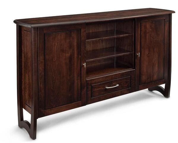 Movie nights look different when the furniture beneath your screen is just as impressive as what’s playing on it. The Amish Handcrafted Megan Modern TV Media Cabinet was designed to anchor your living space with confidence and style. With its clean lines and beautifully curved base, it brings a soft, modern elegance to the room—while quietly doing the hard work of organizing everything behind the scenes. Measuring 71 5/8" wide, 17 1/4" deep, and 39 3/8" high, this media cabinet fits TVs up to 68" and offers generous storage with two doors and one drawer. Tuck away gaming consoles, streaming devices, remotes, and media accessories while keeping your space uncluttered and inviting. Every cabinet is handcrafted by skilled Amish artisans using 100% solid hardwood—no veneers, no shortcuts—just time-honored craftsmanship built for everyday living. Choose from an impressive selection of premium hardwoods, from the warmth of Cherry and Brown Maple to the bold character of Walnut or Rustic Hickory. Then select the finish and hardware that best reflect your style. Whether your home leans modern, transitional, or classic, the Megan Modern TV Media Cabinet adapts beautifully while maintaining its distinctive personality. Modern Amish furniture is about balance—blending contemporary design with old-world woodworking traditions. The result is furniture that feels current yet timeless, refined yet durable enough for busy homes and professional spaces alike. This is not disposable furniture; it’s a long-term investment in quality, beauty, and American-made integrity. Bring organization, craftsmanship, and modern style to the heart of your living room. Order your Amish Megan Modern TV Media Cabinet online today, call our team for personal assistance, or visit one of our Amish furniture store locations. We’re here to answer your questions, guide you through wood and finish options, and help you create the perfect piece for your home.See more products from this woodshop: Middlebury Furniture Collection
