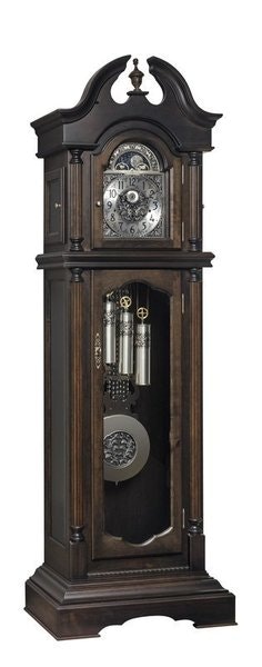 The classic swan‑neck pediment crowns the piece with graceful, antique‑inspired curves. Reeded columns frame a beautifully arched beveled‑glass door, revealing the intricate inner world of timekeeping: a meticulously detailed dial, ornate hands, and the shimmering moon‑phase display that tracks the lunar cycle just as master clockmakers intended centuries ago.