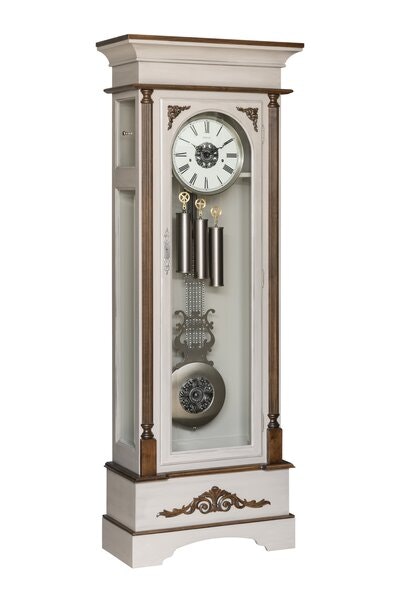 At the heart of the Whitmore is a high-quality German-made Hermle mechanical movement, renowned worldwide for precision and reliability. Founded in 1922, Hermle has set the standard for accuracy and craftsmanship in mechanical clockworks, and this movement reflects that legacy in every component. Paired with an American-made antique white dial featuring Roman numerals and a brushed nickel bezel, the clock balances historic charm with refined detail. The brushed nickel lyre pendulum and weight shells add a striking visual element as they move in perfect harmony.