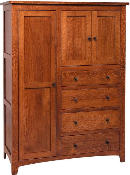 Check out this Amish handcrafted Mission style Chifferobe! The Amish Handies Peak Mission Chifferobe is handmade in your choice of solid wood and finish. There are four drawers in this solid wood chifferobe with a door to the left and two doors on top of the four drawers for storage.
