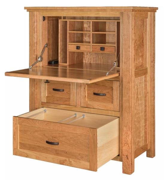 This handsome secretary desk is perfect for saving space in your home. It comes with a handy fold-down top and is Amish handcrafted in the wood and finish of your choice. When you are done working lift up the top to conceal any work in progress and restore a tidy office space in seconds.