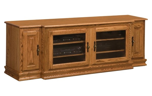 Providing room to organize media in one spot while gracing the living or family room with its solid wood style, the Amish Cochran TV Stand without Towers features raised panel doors and attractive moldings. Two center cabinet doors open to a spacious spot for media players flanked by cabinets with solid wood doors that can house movies, music and more.