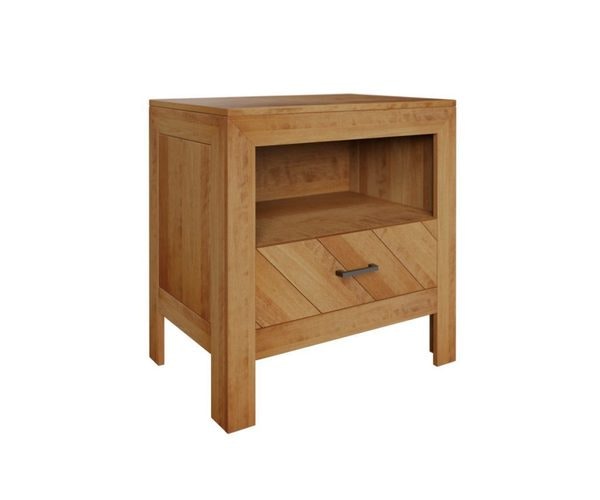 What sets this nightstand apart is the careful attention to detail in its design. The drawer front features a chevron pattern that adds subtle visual texture, turning a simple storage compartment into a small, artful element. It’s a detail that feels intentional, not fussy, and speaks to the craftsmanship of the Amish artisans who build each piece by hand. Above the drawer, an open shelf provides additional space—ideal for displaying a favorite candle or a stack of magazines—balancing closed storage with accessible, open design.