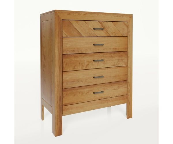 What sets it apart is the artful detail of the top drawer: a chevron pattern, crafted from carefully arranged wood pieces, adds a subtle yet striking focal point. This touch of craftsmanship elevates the piece beyond basic storage, blending modern flair with timeless woodworking. Below, four smooth, unadorned drawers maintain a clean, streamlined look, ensuring the design feels balanced—never fussy.