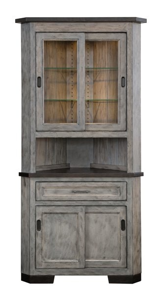 Complete a farmhouse style or modern kitchen with the Amish Drayton Corner Dining Hutch. This solid wood hutch is Amish made in a woodshop in Pennsylvania. Save space while adding stylish storage with this hutch that fits nicely in the corner. Store dishes, serving pieces, coffee mugs and more.