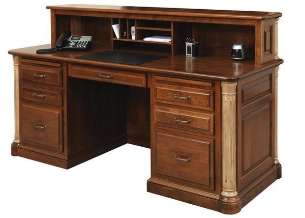 The privacy cubby panel lets you hide your receptionist's clutter from your clients' view. This hardwood desk is sure to give a good first impression. This tall reception desk can be used in a lawyer's office, business office, or even a beauty salon. Please call with questions or for assistance ordering our Amish office furniture and reception furniture.