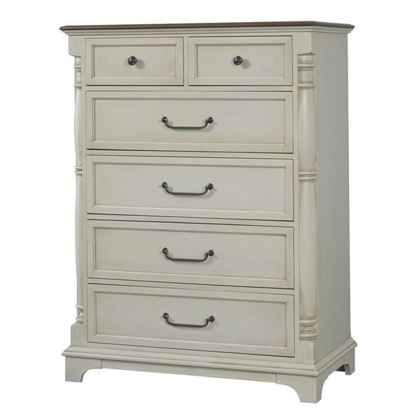 One look at its design reveals careful attention to detail. Flanking the drawers, decorative column accents add a subtle touch of elegance, their gentle molding softening the chest’s silhouette without overwhelming it. The balanced arrangement of drawers—two smaller top drawers perfect for jewelry or socks, followed by three generously sized lower drawers—ensures you’ll have a spot for everything, from bulky sweaters to delicate undergarments. The clean lines of the drawer fronts, paired with a classic base molding and a crisp top edge, give the piece a refined, transitional feel that works beautifully in both traditional and modern spaces.