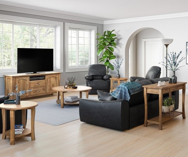 The Amish Kingsman 5-Piece Living Room Set transforms your living space into a cohesive, inviting haven where functionality meets timeless style. This thoughtfully curated collection—featuring a media console, coffee table, two end tables, and a sofa table—works in harmony to create a room that feels both polished and lived-in, perfect for family gatherings, quiet evenings, or entertaining guests.