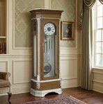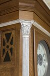 The Leopold stands tall and confident, yet inviting. Its flat top and crown moulding echo classic American longcase design, while clipped corners soften the structure for a refined, tailored appearance. Reeded columns with carved accents rise gracefully along the case, casting shadows that shift beautifully throughout the day. A paneled base grounds the piece with quiet strength, making it feel substantial—an heirloom you can sense even before the first chime plays.