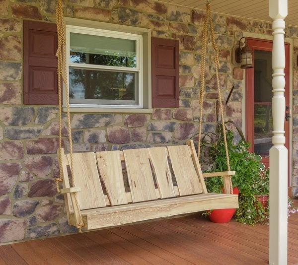 - Rustic charm meets handcrafted design: This 5-foot Timberland swing features a stunning live edge slab seat that showcases the natural beauty of solid wood, crafted by Amish artisans.